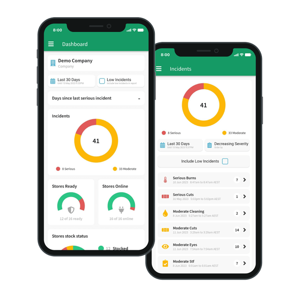 The mobile app shows a live, organisation-wide first aid status, and allows customers to drill into activity to track usage and any incidents.